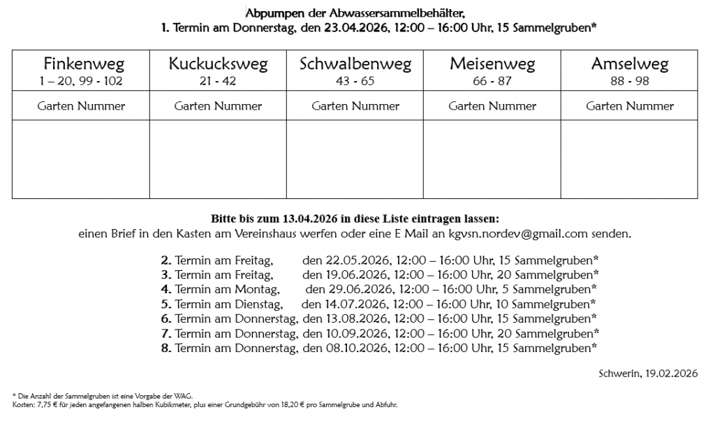 Termine zum Abpumpen der Sammelgruben
