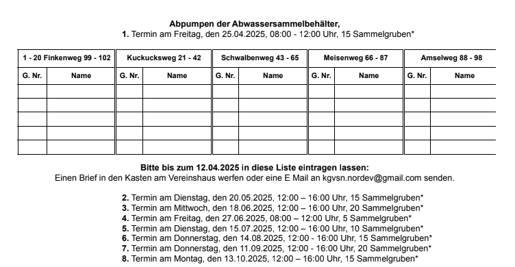 Termine zum Abpumpen der Sammelgruben