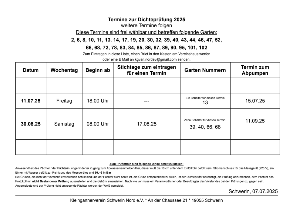 Termine zur Dichtheitsprüfung für Sammelgruben